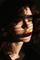 Dit fascinerende portret van een vrouw speelt meesterlijk met licht en schaduw. De scherpe lijnen van het strooklicht geven het beeld een dramatische en mysterieuze sfeer, terwijl de intense ogen en sensuele lippen van de vrouw de kijker betoveren. Een perfect kunstwerk voor liefhebbers van uitzonderlijke fotografie die de magie van licht waarderen.