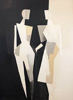 De figuren, abstract en zonder onderscheidende gelaatstrekken, stralen een soort tijdloze elegantie uit, met een sterke nadruk op vorm en lijn.