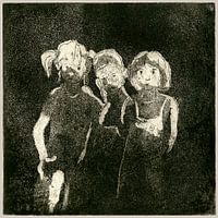 Een groep kinderen groeit op aan de donkere kant van het leven weergegeven als een ets.
