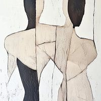 Twee figuren afgebeeld die nauw met elkaar verweven lijken te zijn. De figuren zijn abstract weergegeven, waarbij hun lichamen slechts in rudimentaire vormen zijn weergegeven, zonder details zoals gezichten of handen. De kleuren die zijn gebruikt, bestaan voornamelijk uit zachte, aardse tinten zoals beige en lichtbruin, met contrasterende zwarte accenten. Deze accenten benadrukken de contouren van de figuren en voegen een subtiel gevoel van diepte toe aan de compositie.