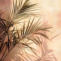 Delicate palmbladeren dansen zachtjes in het licht, hun delicate schaduwen schilderen verhalen op de zachtbeige muur. De harmonieuze combinatie van natuur en ruimte straalt een gevoel van rust en tropische elegantie uit, terwijl de warme tinten een uitnodigende sfeer creëren die inspireert tot dromen.