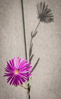 Kleurrijke paarse/roze bloem met een lange schaduw. Bloem komt uit een voetpad. Heldere schaduw op het pad.