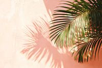 Een zacht vleugje tropische elegantie ontvouwt zich als het licht teder door de tere bladeren van een palmboom danst. Hun artistieke schaduwen tekenen mysterieuze patronen op de warm geschilderde muur, die glanst in een delicate tint roze. Hier wordt de natuur gecombineerd met een vleugje stedelijke flair, een spel van licht en vorm.
