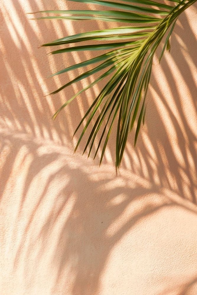 Een spel van licht en schaduw ontvouwt zich als de fijne, gebogen bladeren van een palmboom zachtjes tegen de muur leunen. Hun diepe, betoverende schaduwen dansen op de warme, aardse achtergrond en geven de kamer een vleugje exotisme en rust. Geïnspireerd door tropische landschappen, nodigt dit decor je uit om te dromen en te ontspannen.