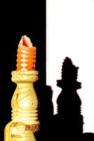 Een kaars op een sokkel, die sterk wordt verlicht door de zon en zo een sterke schaduw werpt op de muur erachter. Het sterke contrast tussen zwart en wit is echt gebeurd en ik vond het prachtig. De situatie speelde zich binnen af. De kaars stond op een oude houtkachel, terwijl de laagstaande zon door het raam naar binnen scheen.