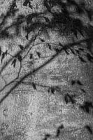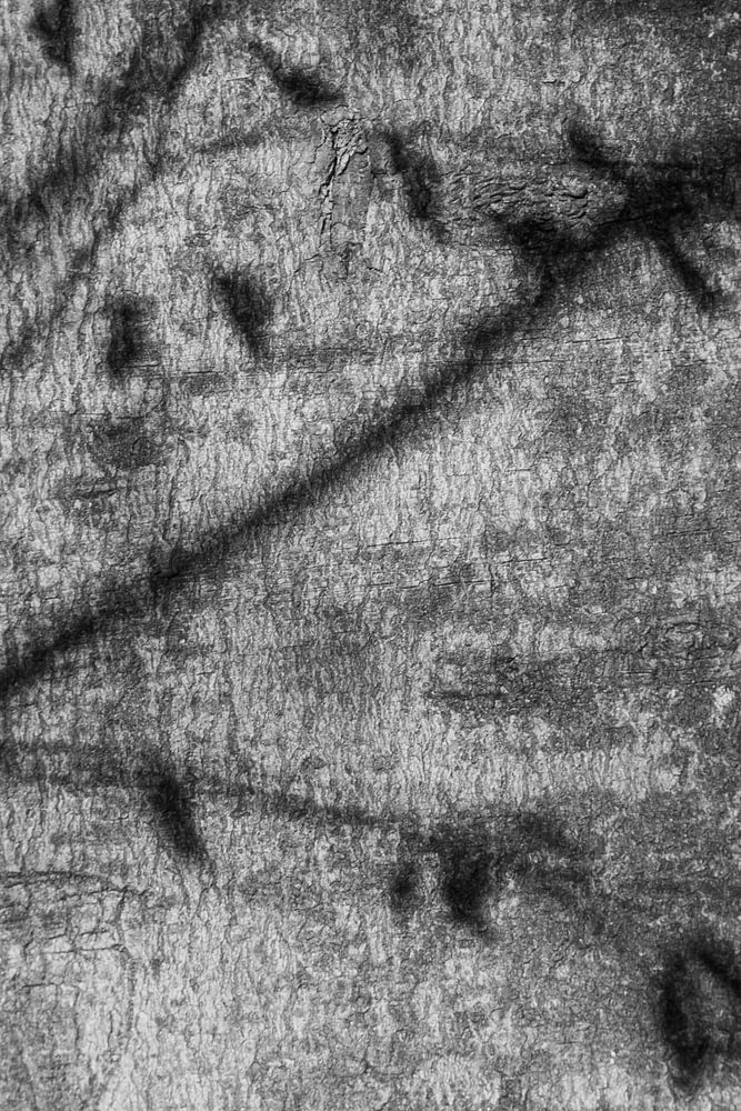 De schaduw van bladeren op de stam van de boom waar ze aan groeien, in zwart/wit.