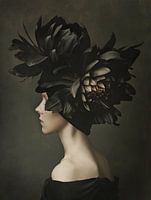 Een mystiek, surrealistisch vrouwenportret waarin weelderige, donkere bloemsieraden het hoofd van de vrouw sieren. De bloemen zijn in diep, intens zwart, wat de foto een krachtige, mysterieuze uitstraling geeft. De bloemenjuwelen lijken bijna een kroon en omlijsten het gezicht van de vrouw op een dramatische manier die haar raadselachtige uitstraling versterkt. De donkere achtergrond, bijna zwart, creëert een sterk contrast en laat de vrouw met haar prachtige, sombere sieraden centraal staan. Haar geabstraheerde gelaatstrekken en de surrealistische afbeelding creëren een bijna droomachtige, mystieke sfeer die de kijker meeneemt naar een andere, bijna bovennatuurlijke wereld.