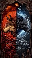 > "Yin en Yang wolven: Twee oerbeesten, een van vurige rode woede en een van koud, maanverlicht blauw, staren uit een verdeeld frame. Een perfect symbool van evenwichtige tegengestelde krachten.