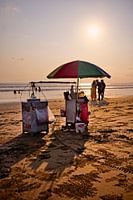 De foto legt een typisch, authentiek tafereel vast op het strand van Pangandaran. Op de voorgrond heeft een straatverkoper zijn geïmproviseerde kraam opgezet, beschermd door een grote felgekleurde parasol. In zijn kleine koelboxen en manden biedt hij lokale specialiteiten aan bezoekers die genieten van hun avond aan zee. Op de…