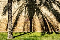 Stam van de dadelpalm en schaduw van de dadelpalm op een muur