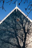 Deze indrukwekkende foto vangt de essentie van traditionele Nederlandse architectuur met een helderblauwe gevel en de schaduw van een boom die over het huis valt. De witte accenten en de eenvoudige, strakke lijnen van de dakrand contrasteren…