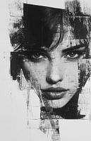 intrigerend portret in zwart-wit dat speelt met abstracte en figuratieve elementen. Het gezicht van een vrouw is prominent aanwezig, weergegeven met scherpe details in de ogen, neus en mond, terwijl de rest van de compositie vervaagd is door ruwe, overlappende texturen en schaduwen. De penseelstreken en gestructureerde vlakken zorgen voor een fragmentarisch effect, alsof het gezicht door stukken canvas wordt onthuld of verborgen. Dit creëert een mysterieuze, bijna introspectieve sfeer.
