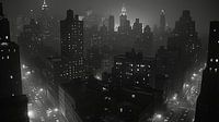 Verlies jezelf in de suggestieve silhouetten van deze zwart-wit skyline. Elk gebouw lijkt een verhaal te fluisteren, terwijl schaduwen zich vermengen met de nachtelijke lucht.