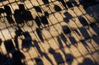 Liefde hangsloten hangend aan hek of rooster die schaduwen werpen op de grond van voetgangersloopbrug Hohenzollern over de Rijn in Keulen
