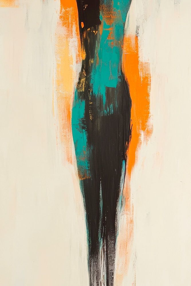Een indrukwekkend samenspel van kleuren en vormen ontvouwt zich in dit gestileerde silhouet, dat de kijker betovert met zijn gedurfde zwarte contouren en levendige accenten in turquoise en oranje. Deze moderne compositie straalt een gevoel van vrijheid uit en zou perfect zijn voor een creatief kantoor waar inspiratie en energie stromen.