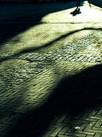 Schaduwen van boomtakken en van een man op een oud plein, waar net even de avondzon op viel.
