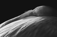 "Schaduwspel" is een artistiek monochroom portret van een flamingo, gevangen in een intiem moment van rust. De subtiele belichting werpt een zachte gloed op de fijne structuren van het verenkleed, terwijl de rest in het duister blijft, wat een dramatische maar vredige scène creëert. Het gevoel van sereniteit wordt versterkt door de zichtbare, waakzame oog van de flamingo, die een diepgaande verbondenheid met de kijker vormt. Dit stuk biedt een unieke kijk op de delicate schoonheid van deze iconische vogel, vaak geassocieerd met kleur, nu teruggebracht tot de essentie van vorm en contrast.
