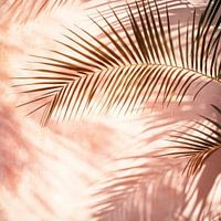 Zachte schaduwen dansen op een warme, roze achtergrond. De delicate palmbladeren trekken de aandacht met hun gebogen lijnen en diepe insnijdingen. Licht en duisternis vervlechten zich in een harmonieuze compositie die een gevoel van zomer en ontspanning uitstraalt. Een uitnodigend natuurspel dat de zintuigen betovert.