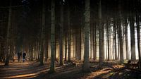 Winters zonnetje verwarmd twee wandelaars in een Hollands dennenbos. De zon maakt hierbij een mooie driehoek tussen de bomen door. Het licht doet denken aan schilderijen van Hollandse meesters uit de gouden eeuw. De foto is genomen bij de Trappenberg in Blaricum.