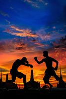 De foto legt een intense bokswedstrijd vast onder een adembenemende zonsondergang. De silhouetten van de vechters vallen op, terwijl de oranjerode lucht contrasteert met delicate wolkenkleuren. Tempels en torens op de achtergrond geven de scène een krachtige culturele diepte. Een visuele uitdrukking van kracht en passie!