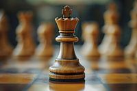 Een fascinerende afbeelding toont een schaakbord met een majestueuze koningin in het midden. Het gedetailleerde houtsnijwerk en de vorstelijke uitstraling van de figuur geven de afbeelding een elegante en krachtige sfeer. De koningin symboliseert kracht, intelligentie en strategisch denken terwijl ze het schaakbord regeert en haar tegenstanders uitdaagt.