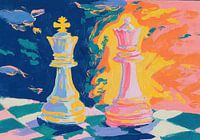 Een abstract schilderij toont de schaakstukken koning en koningin naast elkaar op een geblokt schaakbord. De koning links is lichtblauw met gele accenten, gekroond met een gouden kruis, terwijl de koningin rechts roze is met gele accenten en een puntige witte kroon. Dikke, expressieve penseelstreken benadrukken vorm en kleur. Het bord bestaat uit groene en witte vierkanten, de donkerblauwe achtergrond met oranjegele accenten rechts zorgt voor contrast en dynamiek. De gestuele schilderstijl geeft diepte, textuur en beweging. De compositie centreert de figuren en combineert structuur met expressiviteit, waardoor het tafereel levendig en visueel aantrekkelijk is.