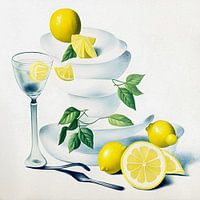 Dit artwork toont vreemd gevormde citroenen die op abstracte witte schalen lijken te liggen. links in beeld staat een wijnglas en er ligt surrealistisch gevormd bestek. De kleuren van het schilderij zijn voornamelijk wit, geel en groen, wat bijdraagt aan de surrealistische sfeer. De achtergrond is wit en er is weinig diepte of…