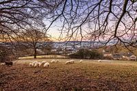 Een groep grazende schapen bij zonsopkomst in het Zuid-Limburgse Heuvelland bij Cottessen.