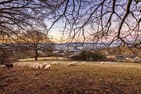 Grazende schapen tijdens zonsopkomst in Cottessen (Zuid-Limburg, Vijlenerbos)