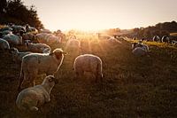 Schapen in het tegenlicht van de opkomende zon tijdens het Gouden uur in Eys (Zuid-Limburg, Heuvelland, Nederland).
