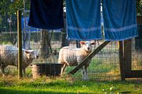 Schapen en en drogende handdoeken aan waslijn, grappige foto met mooi avondlicht