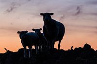Schapen familie, tijdens een zonsondergang in een Nederlandse polderweide.