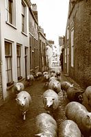 Een kudde schapen loopt door de straten van de oude wijk Bergkwartier in de Overijsselse stad Deventer. Dit middeleeuws aandoende tafereel is gemaakt tijdens het Charles Dickens festijn.
