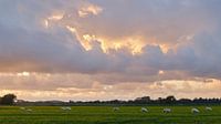 De polder vlakbij Alkmaar: een prachtige zonsondergang die de wolken pasteltinten geeft. Een aantal schapen op het groene grasland.