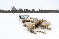 Schapen in een besneeuwde weide in een winterlandschap tijdens een koude winterochtend in het natuurgebied de Veluwe in Gelderland, in Nederland.