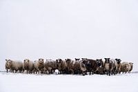 Schapen in een besneeuwde weide in een winterlandschap tijdens een koude winterochtend in de IJsseldelta in Overijssel, in Nederland.