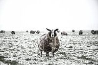 Schapen in een besneeuwde weide in een winters landschap tijdens een koude winterochtend in de IJsseldelta regio in Overijssel, in Nederland.