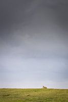 Deze foto is genomen op een stormachtige avond in Denemarken. Je ziet een schaap op een dijk, terwijl op de achtergrond een onweerswolk te zien is.
