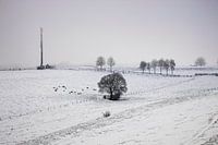 Een dun laagje sneeuw in een minimaal landschap waar schapen grazen in een weiland bij het Zuid-Limburgse dorp Gulpen.