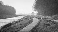 In de ondergaande zon begraast een kudde schapen de dijk. Er waait een felle koude wind en er valt zelfs wat poedersneeuw, te weinig om het landschap wit te kleuren, maar het geeft wel even een prachtig beeld.