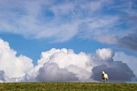 Schapen op de Noord-Friese dijk in de voorkant van de wolken.