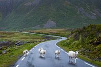 Op een regenachtige dag liepen deze schapen over de weg. Een tafereel dat je wel eens kan tegenkomen op de kleine Noorse wegen.