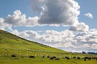 Schapen op groene weide tussen Mossburn en Te Anau, Southland, Zuidereiland, Nieuw-Zeeland