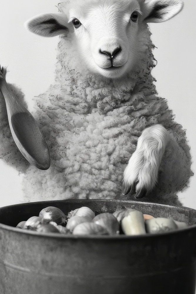 Een charmant tafereel roept het gevoel op van een landelijke idylle: een spraakzaam schaap staat humoristisch bij het fornuis en dirigeert zijn kookkunsten met een lepel. De combinatie van dier en keukenactiviteit tovert een glimlach op het gezicht en is ideaal voor de keuken of eetkamer, waar het gasten kan vermaken.