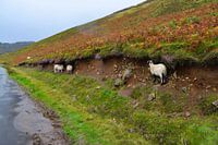 Schapen schuilen tegen de regen langs een eenzame weg op Isle of Skye