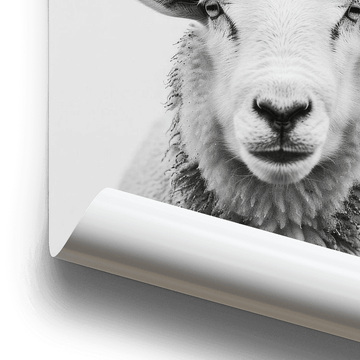 Deze zwart-wit foto van een schaap legt de zachte schoonheid en vredige uitdrukking van het dier vast. Het heldere, minimalistische beeld benadrukt perfect de zachte textuur van de vacht en de fijne details van het gezicht. Een charmant kunstwerk dat zowel natuurliefhebbers als liefhebbers van stijlvolle decoratie zal aanspreken.