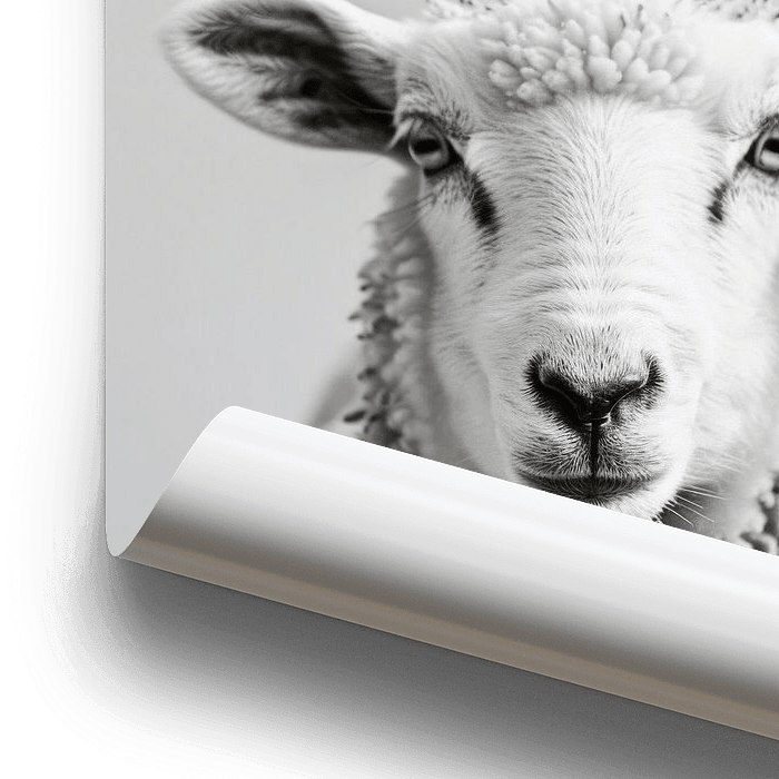 Deze zwart-wit foto van een schaap legt de zachte schoonheid en vredige uitdrukking van het dier vast. Het heldere, minimalistische beeld benadrukt perfect de zachte textuur van de vacht en de fijne details van het gezicht. Een charmant kunstwerk dat zowel natuurliefhebbers als liefhebbers van stijlvolle decoratie zal aanspreken.
