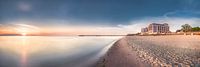 Koop dit landschapskunstwerk Scharbeutz strand met strandstoelen en Bayside Hotel in het ochtendlicht. van Voss fotografie op canvas, aluminium dibond, (ingelijste) fotoprint, behang en ArtFrame, op maat geprint in Fine-Art kwaliteit.