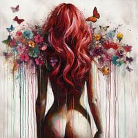 Een opvallend portret van een vrouw met prachtig scharlakenrood haar, omlijst door vlinders en een weelderige bos aquarelbloemen. Diepe schaduwen vormen de schouders, ruggengraat en taille, waardoor een sterk silhouet ontstaat dat afsteekt tegen de lichte, open achtergrond. De bloemenmassa verzamelt zich achter de figuur als een…