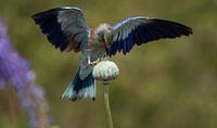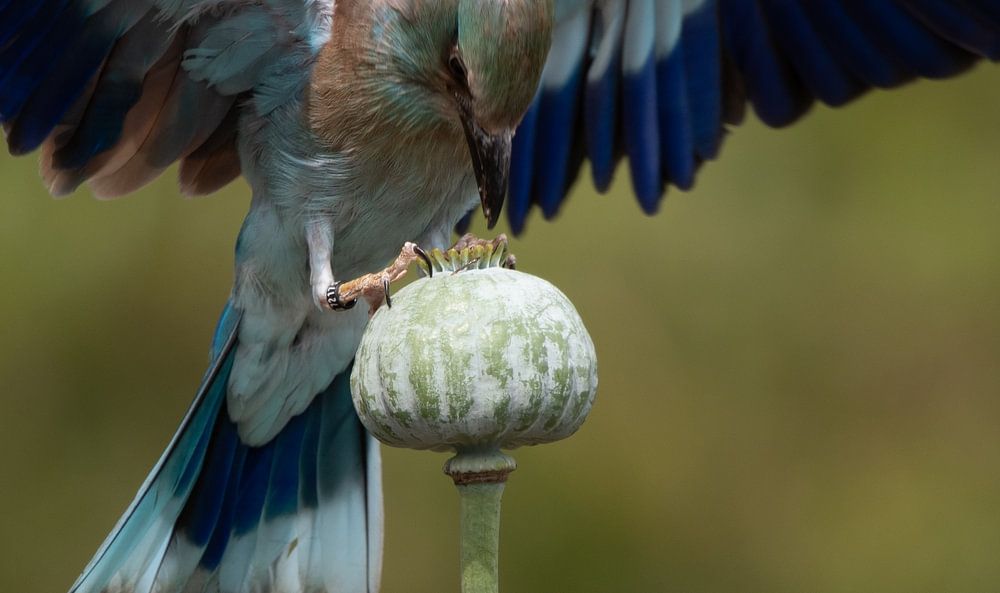 Wat een powervogel. Hoe hij zijn prooi wilt pakken op de papaverbol.